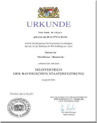 - Meisterprüfung im Metallbauerhandwerk, mit Auszeichnung